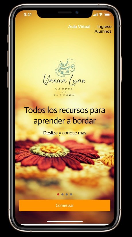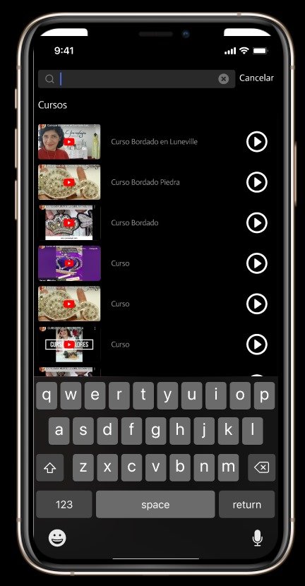 App para una escuela de clases de bordado. Con una interfaz pensada para el uso fácil de la visualización de videos de cursos y anuncios. Ideal para cuando se tiene varios videos alojados en tu sitio web y quieres que se destaquen todos.