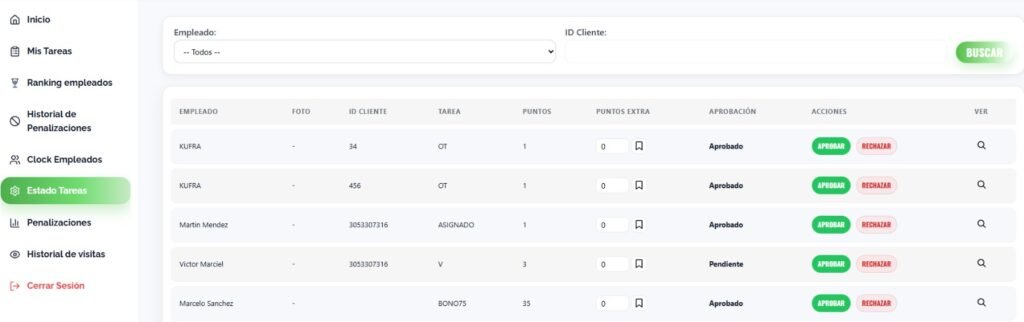 Tabla de gestión de administradores para aprobar tareas de empleados.